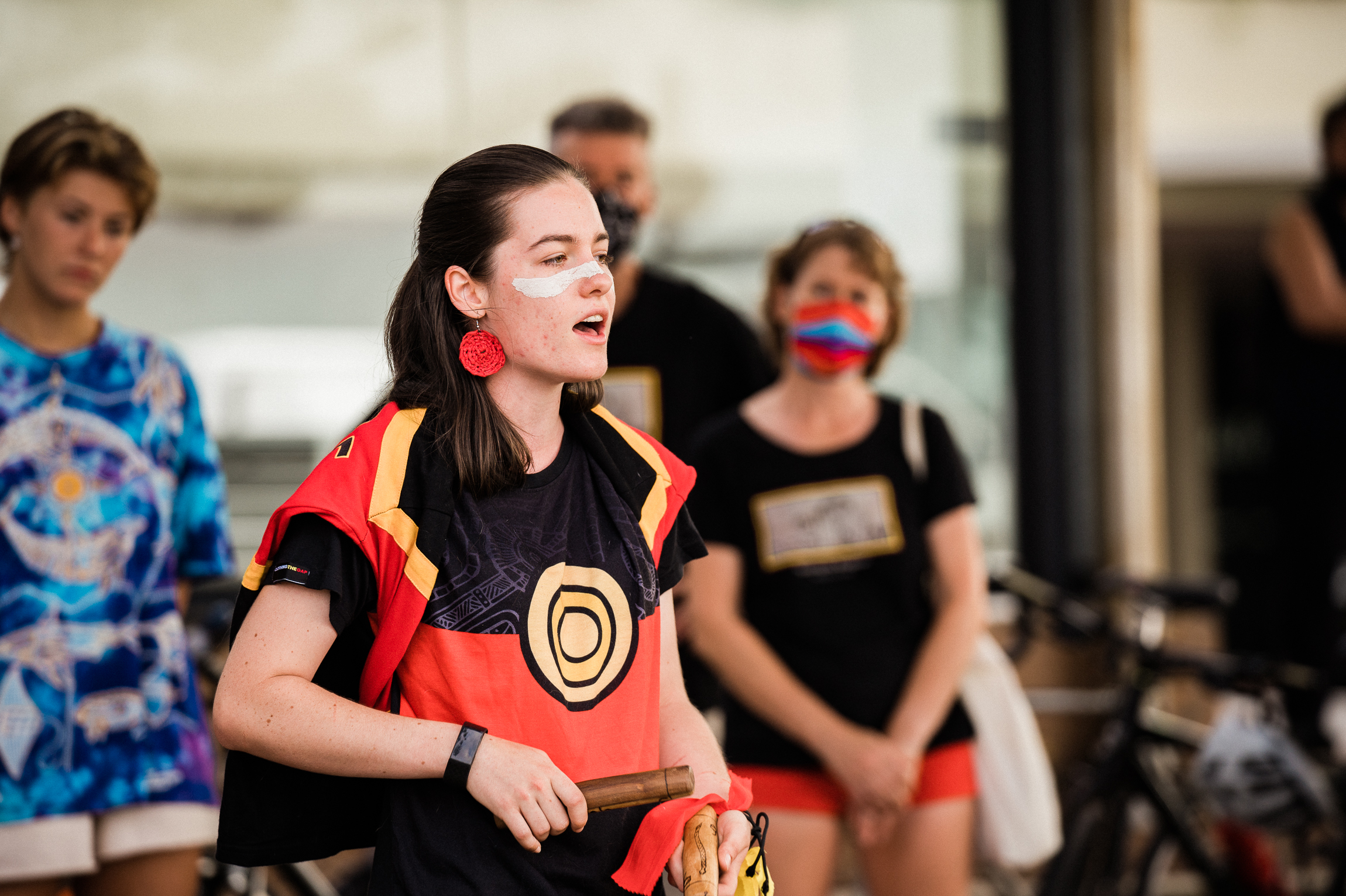 Didgeridoo playing was by Matt James, singing by the three Wassell sisters in Darug language, as well as a song by Vince Konijn, finishing with a group rendition of 'We are Australians'.