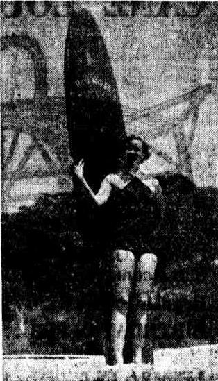 The first hollow board to take part in an official race was used by Sydney's heaviest board-rider, Frank Adler, at a carnival in 1934. Adler, who weighs 17 stone, found by experiment that a long, hollow board supported his great bulk comfortably. Fellow competitors laughed at his "queer" board, but respected it after he won the race by 100 yards. The speed at which Adler's powerful arms propelled his light board made his opponents look clumsy. Adler found that this new board could catch a green wave, while the solid boards wallowed in the troughs. Present Australian champion is 20-year-old Fred Knotting, of Manly. Knotting is called "The Beach comber" by fellow-surfers.