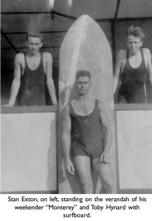 Australian legend of board riding, Snowy McAlister, also remembered someone from Narrabeen having a surfboard around that same time. Stan Exton, a pioneer and Life Member, always maintained that he brought the board to Narrabeen prior to 1915 and that he and his friend Toby used to share it. This is substantiated by a photo taken outside a cottage owned by Stan: