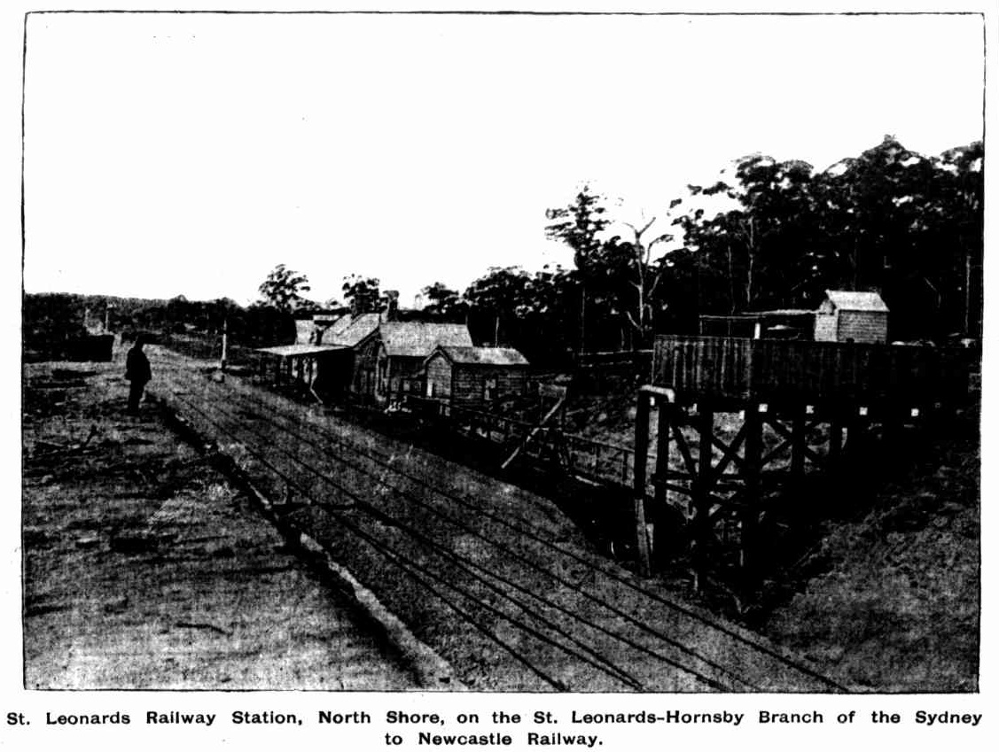 The St. Leonards rail-way station (see our illustration) is situated close to the Lane Cove-road, which crosses the line on an overhead bridge a few feet from the water tank. The tank has a capacity of 10,000 gallons, and is supplied from the main on the Lane Cove road. The platform is 264ft long by from 12ft to 15ft wide. The buildings are substantially built of brick, and comprise a lamp and store room, a ticket office, a general waiting-room, and a ladies' waiting-room, with lavatory and other conveniences. A wide verandah runs along the principal portion of the building. At the rear a pathway has been formed fronting the road which runs from the station to the Lane Cove road. Near the tank, and facing the Lane Cove road, is a comfortable five-roomed cottage occupied by Mr. F. Willis (the stationmaster) and his wife. The contractor for the station, stationmaster's house, &c., was Mr. William Refschauge, who appears to have carried out his work in a most substantial man-ner. At the present time the buildings are being painted, and have a glaring, brand-new appear-ance. There are four trains running along the line per day; and the average number of pas-sengers booked at St. Leonards is said to be twenty-two. The North Shore, Sydney. (1890, February 15). Australian Town and Country Journal (Sydney, NSW : 1870 - 1907), p. 27. Retrieved from http://nla.gov.au/nla.news-article71107995