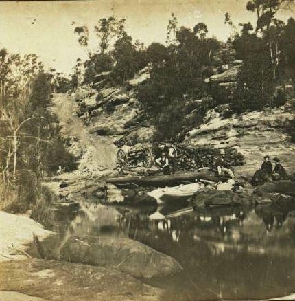 View of the ford over the Lane Cove River at the tidal limit at the 'Blue Hole' circa 1860. The cart road was superceded by today's Ryde Road and Lane Cove Road linking Pymble and Ryde. Notice the pile of timber billets and the cart. Photo taken by Professor Smith (in stovepipe hat) of Sydney University. Primary Records reference number 5/2861
