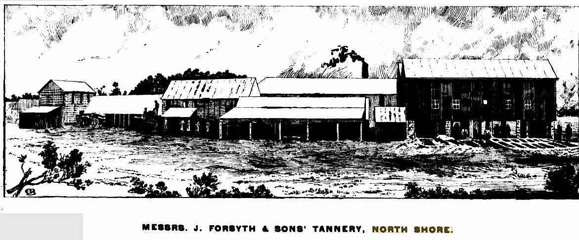 There are some enterprising business men at North Shore. Of these, Messrs. J. Forsyth and Sons, tanners and carriers, merchants and importers, are amongst the most prominent. They own the North Willoughby Tannery, their city warehouse being situated at 29 and 31 George-street West The success attending the operations of this important firm goes to show what pluck, perseverance, and energy can accomplish. Less than a quarter of a century ago they started business at North Willoughby, their capital being just £20. Mr. Jas. Forsyth, senior, the founder of the firm, retired from it nine years ago, having realised a fortune. His two sons, who now carry on the business -Messrs. Thos. Todd and Robert Forsyth are following rapidly in their father's foot-steps. Their tannery is one of the best equipped in the colony, and the goods they turn out have won an intercolonial reputation.