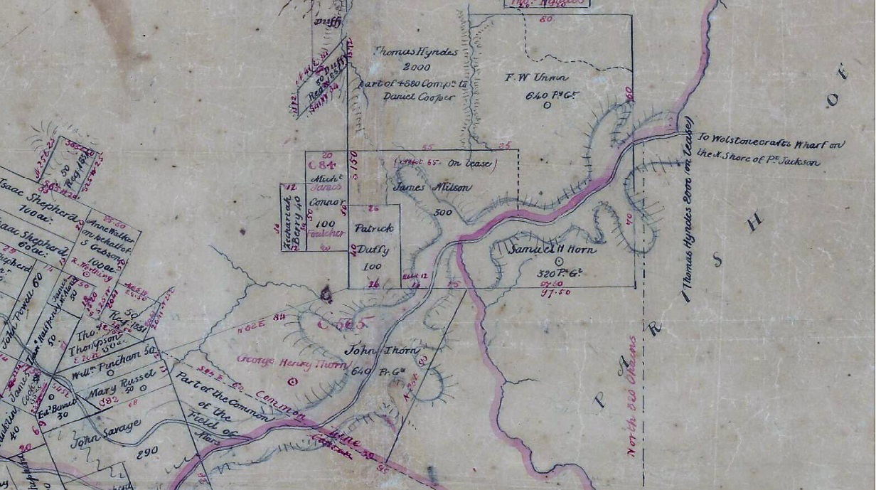589. John Thorn, 640, Six hundred and forty acres, parish of South Colah, commencing at the south-west corner of Patrick Duffy's 100 acres ; and bounded on the north by that grant by part of Milsom's and by part of Samuel Horn's 320 acres 55 chains; on the east by a line south 25 degrees 30 minutes west 95 chains to the Field of Mar's Common ; on the south by that common being a line north 64 degrees west to the Pennant Hills Road 39 chains; and again by a line north 64 degrees west 60 chains; and on the north-west by a line north 62 degrees east 84 chains to the south-west corner of Patrick Duffy's 100 acres as aforesaid. GRANTS OF LAND. (1839, September 7). New South Wales Government Gazette (Sydney, NSW : 1832 - 1900), p. 989. Retrieved from http://nla.gov.au/nla.news-article230384451