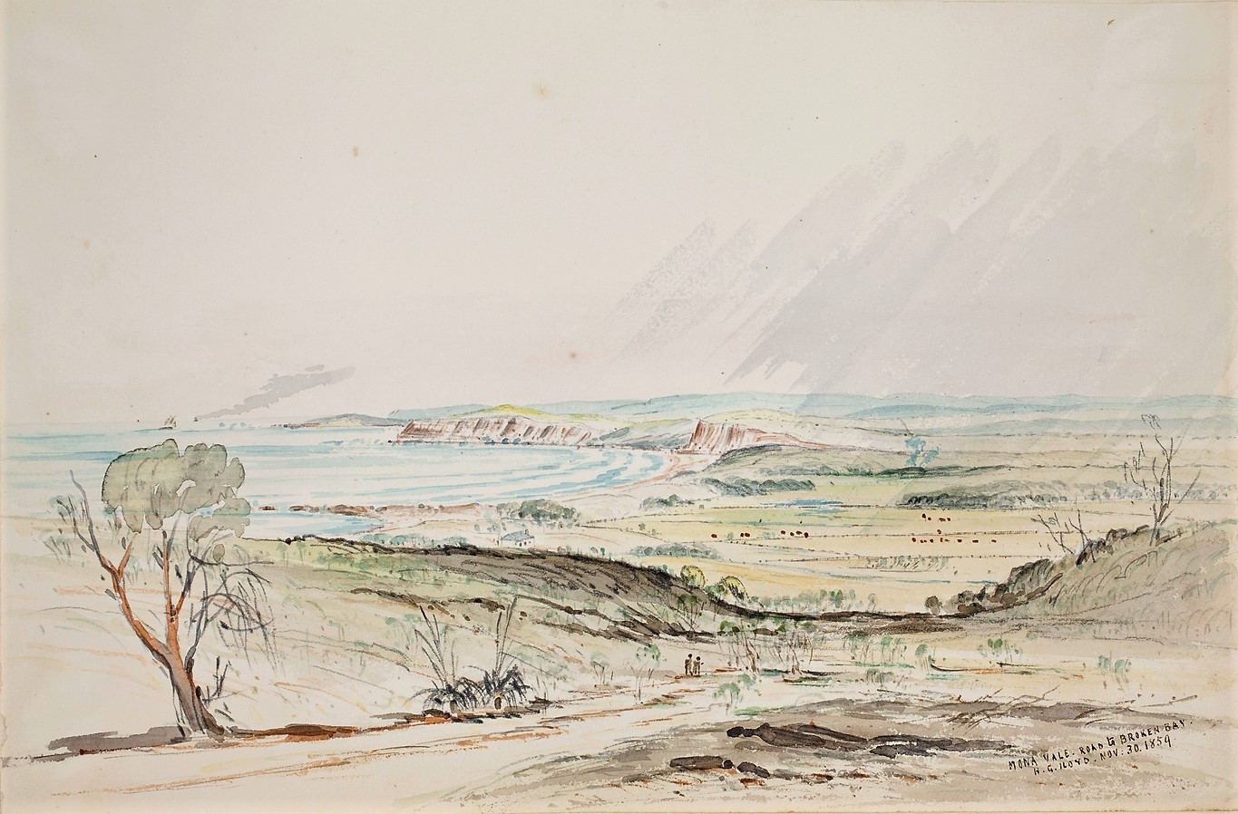 F.109 Mona Vale road to Broken Bay from Volume 1: Sketches of N. S. [New South] Wales, 1857-1888 / by H. Grant Lloyd, Image No.: a5894117h, courtesy Dixson Library, State Library of New South Wales. NB: This aspect looks as though the walkers are heading to Mona Vale from Newport, also there is no St John's on what we now call Mona Vale headland - that chapel opened in 1871.
