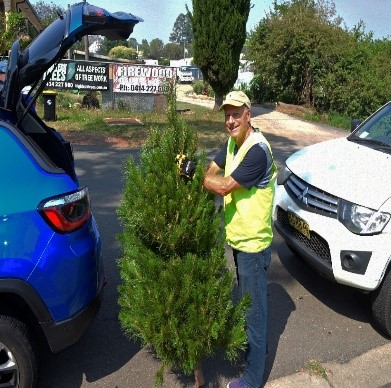 Mervyn Simmons, UK Rotarian, assisting UNB Rotary, selling Xmas Trees, Dec 2019