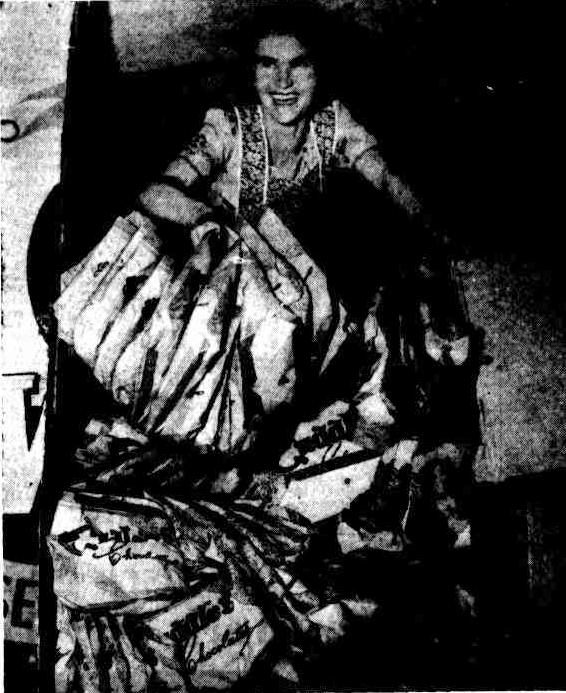 Mrs. Alice Brown unloading sample bags at the Showground yesterday, in readiness for the opening of the Royal Easter Show to-day.
