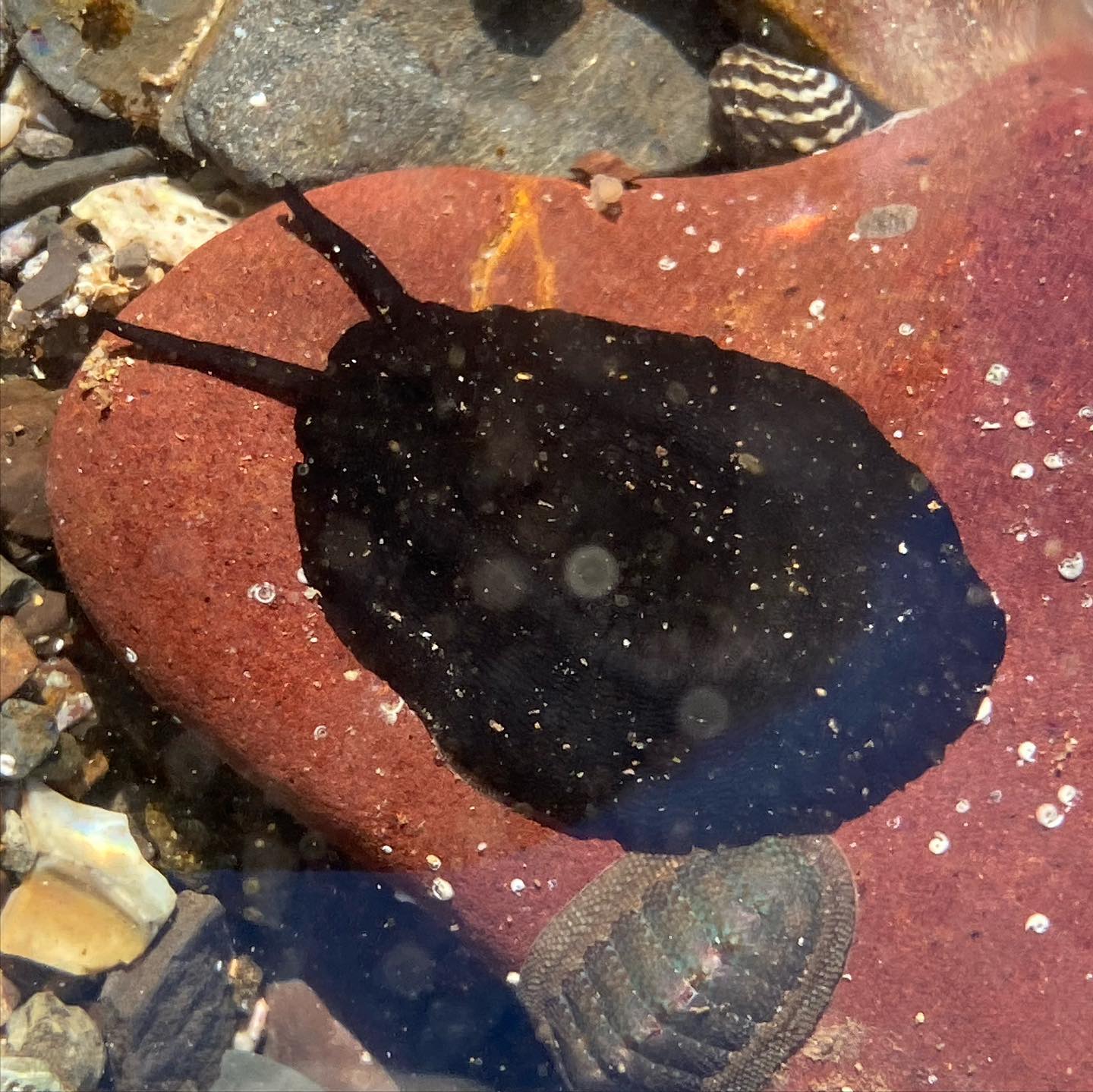 Limpet with barnacles on it: Limpets are a marine gastropod mollusc that has a low conical shell. Barnacles on top are are marine and estuarine crustaceans and related to crabs!