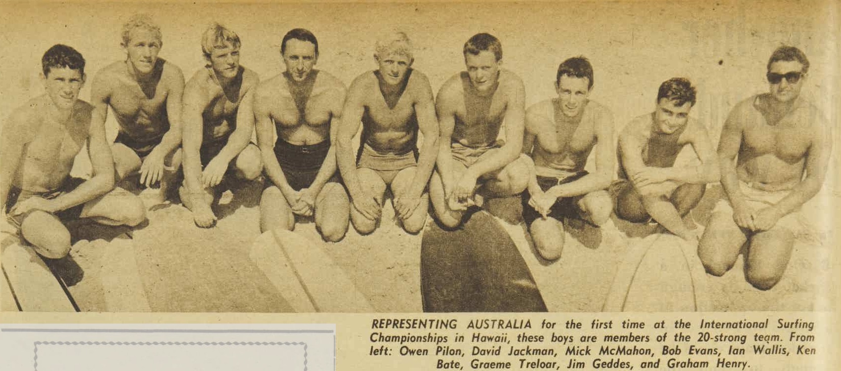 The first Australian to win a surf championship overseas, he was a member of the 20 strong Australian team which competed in the International Surfing Championships at Makaha Beach, Hawaii, last summer. Because he injured a leg he had to drop out before the finals. Several members of the team qualified, but had to return home before the finals, delayed by lack of a suitable surf, were held.