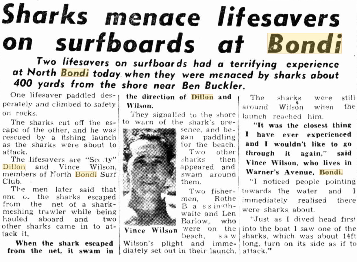 Sharks menace lifesavers on surfboards at Bondi (1949, January 14). The Sun (Sydney, NSW : 1910 - 1954), p. 1 (LATE FINAL EXTRA). Retrieved from http://nla.gov.au/nla.news-article230238556