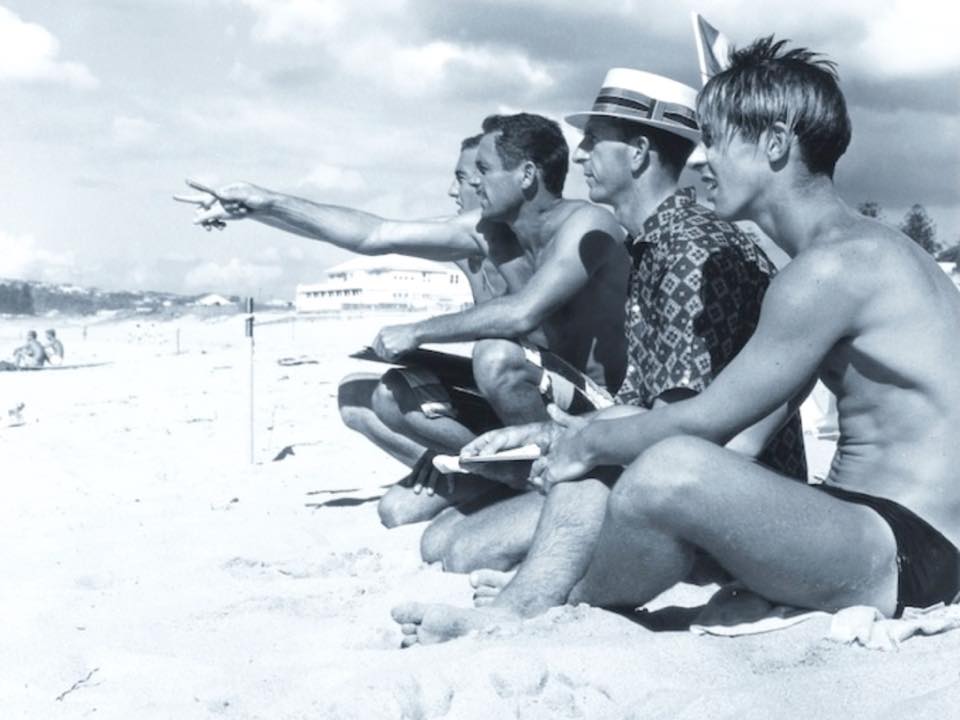 IN LINE on South Bondi Beach are members of the South Bondi Board Club. From left are Scott Dillon, "Bluey" Mayes, Andy Cochran, Rod Cartlidge, Barry Ross, and Des Price. Some wear long pants, and have foam rubber built into the knees, to protect their legs, especially when paddling their surfboards out to catch a wave. From Hot doggers' of the surf (1958, December 3). The Australian Women's Weekly (1933 - 1982), p. 3. Retrieved from http://nla.gov.au/nla.news-article48077087