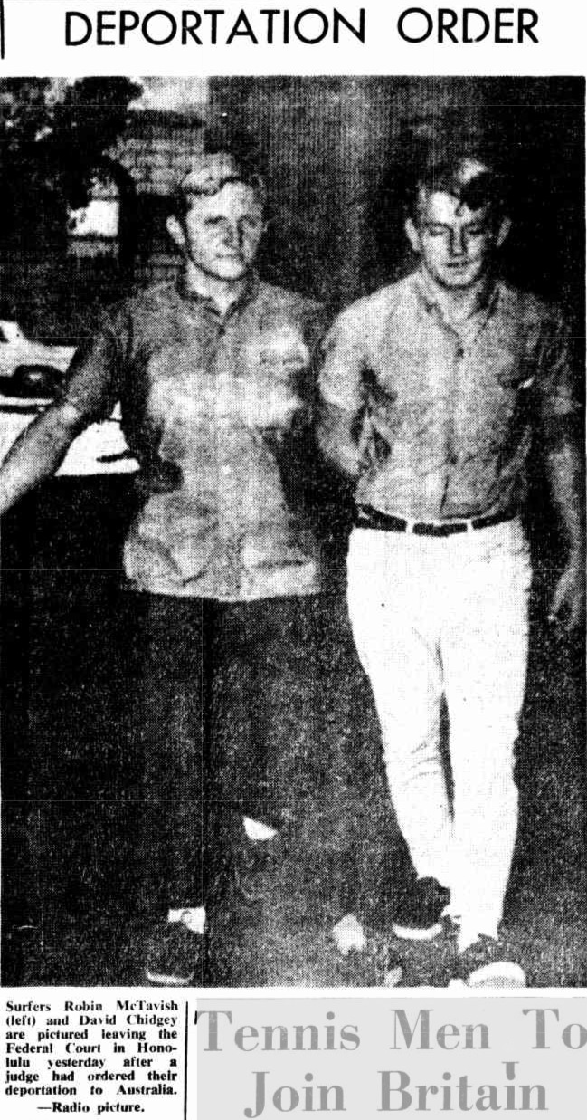 Immigration officials discovered their presence in Hawaii from an Australian newspaper clipping and sought them out at Sunset Beach. DEPORTATION ORDER (1963, December 21). The Canberra Times (ACT : 1926 - 1995), p. 40. Retrieved from http://nla.gov.au/nla.news-article104283106