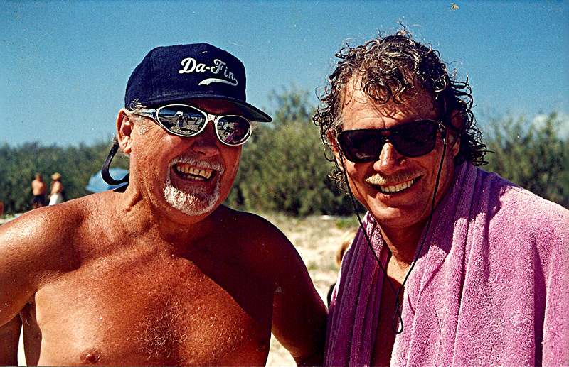 Scotty with Bernard Midget Farrelly at the 64 world titles re-enactment in Noosa. Photo courtesy Ron Turton