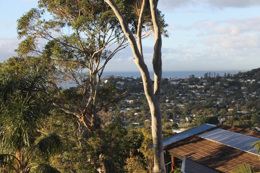 Whale Beach is the tree dappled rock lookout on the corner of Surf and Byna roads this gum tree affords - and also great old trees line the road up along Bynya