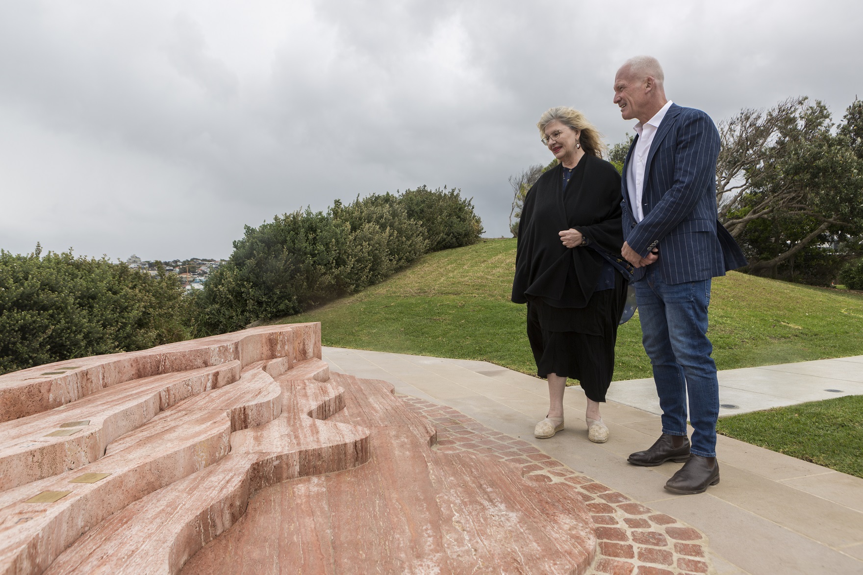 ACON CEO Nicolas Parkhill and Waverley Mayor Paula Masselos at the memorial in Marks Park, Tamarama.