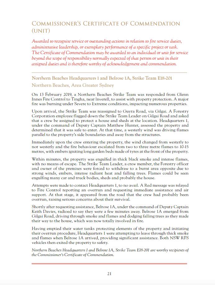 Northern Beaches Headquarters 1 and Belrose 1A, Strike Team E18-201 are worthy recipients of the Commissioner's Certificate of Commendation.