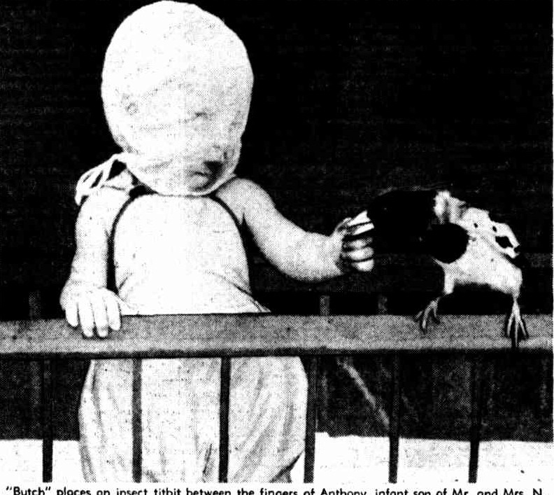 "Butch" places an insect titbit between the fingers of Anthony, infant son of Mr. and Mrs. N. Guise, at Warrie station. The net over the babe's head protects him from the bird's feeding attempts as well as flies.