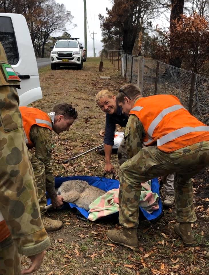 When the fire grounds are opened up to wildlife rescuers, they do what they call a 'black-walk'. Any injured animals that can be treated are usually ‘darted’ with a tranquilliser, if mobile still, and brought straight into care. Lynleigh has shared a video and photos this week of Australian Army men and Reservists helping them move the larger, heavier kangaroos to where they can be treated.