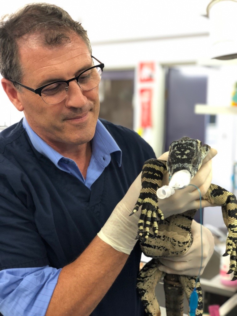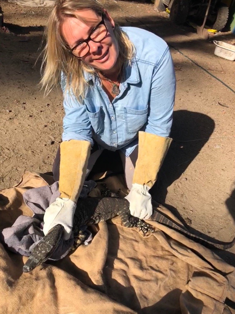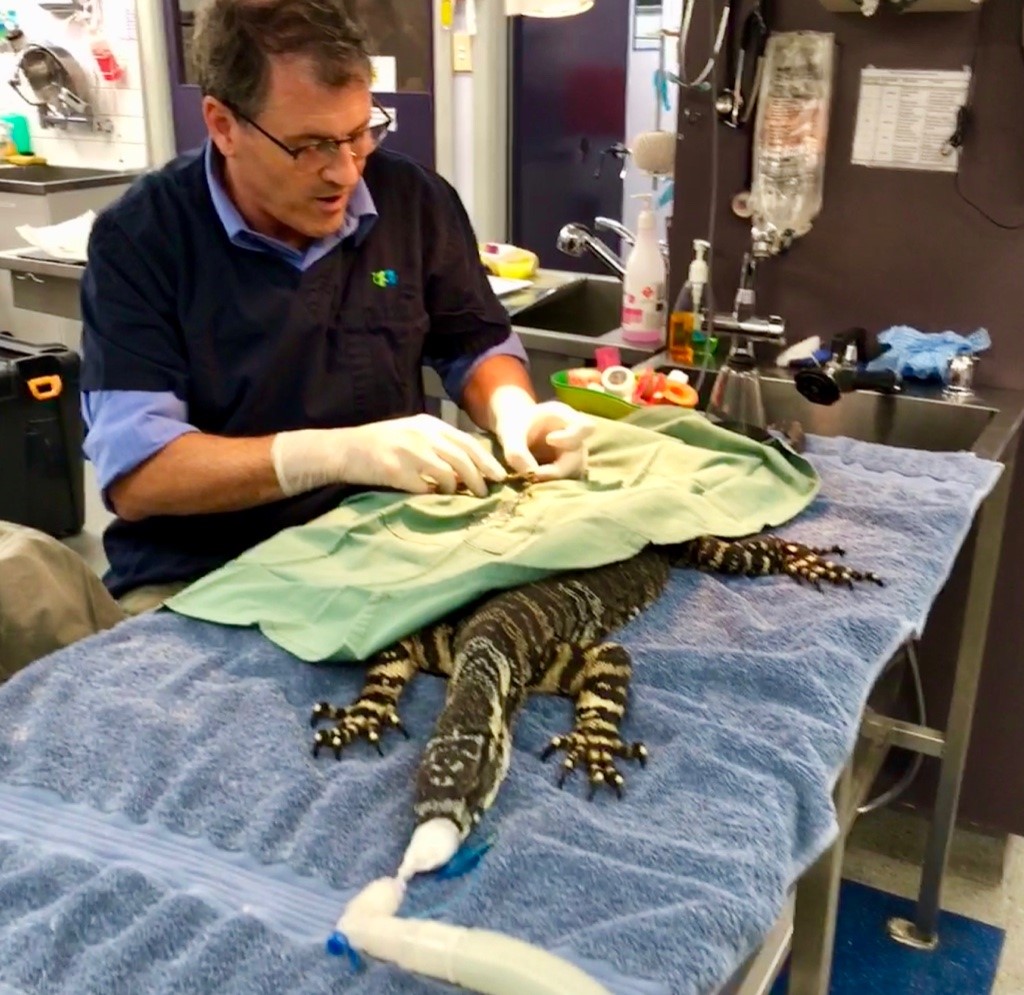 Georgie caught this lace monitor with 2 toes that were damaged and each dangling by a small piece of skin. Dr David Ward surgically removed them.