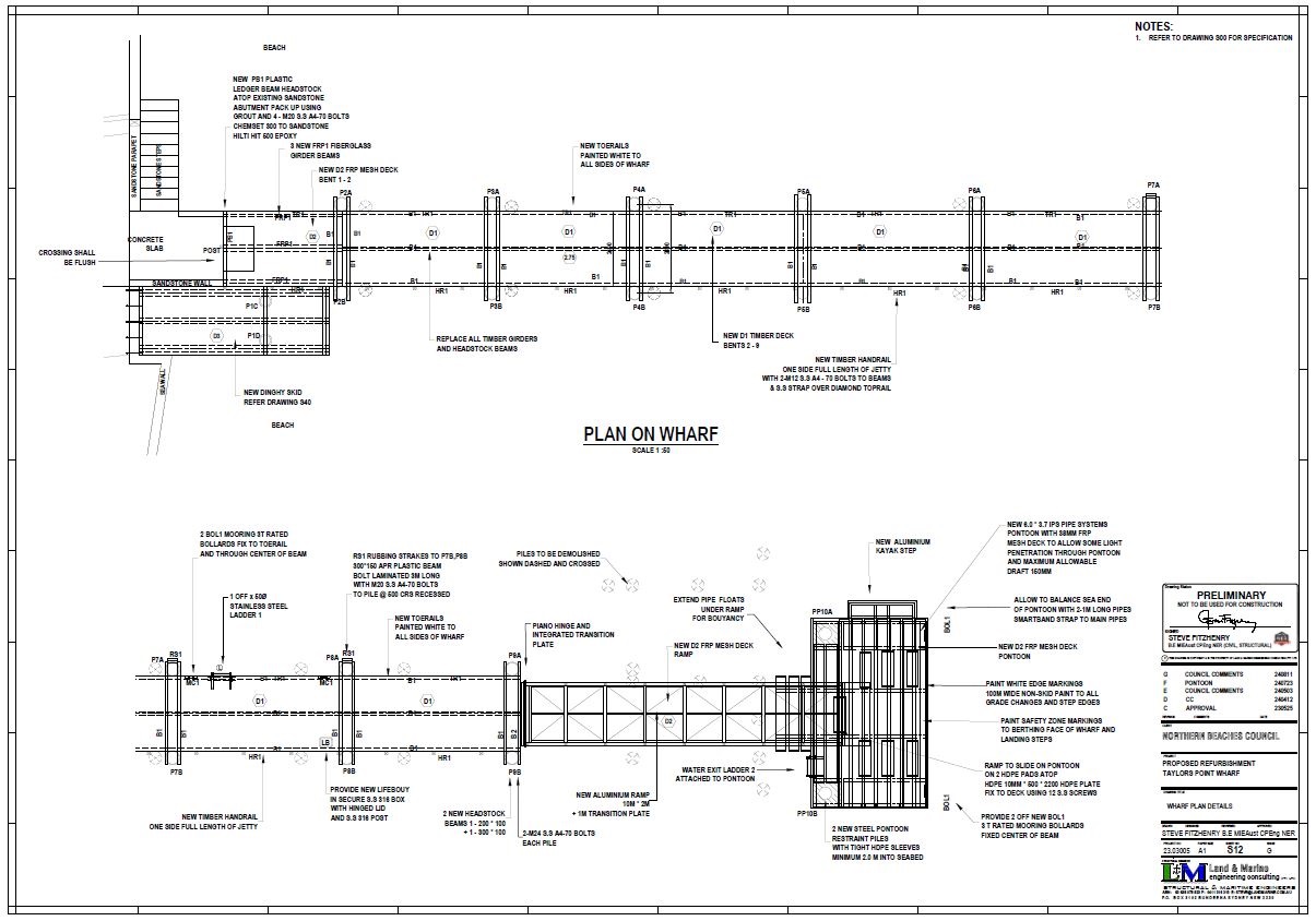 A condition assessment of the wharf at the end of Taylors Point Road, off Hudson Parade, Clareville, revealed that major refurbishment is required to restore it to a good condition and comply with Australian Standards for marine infrastructure design.