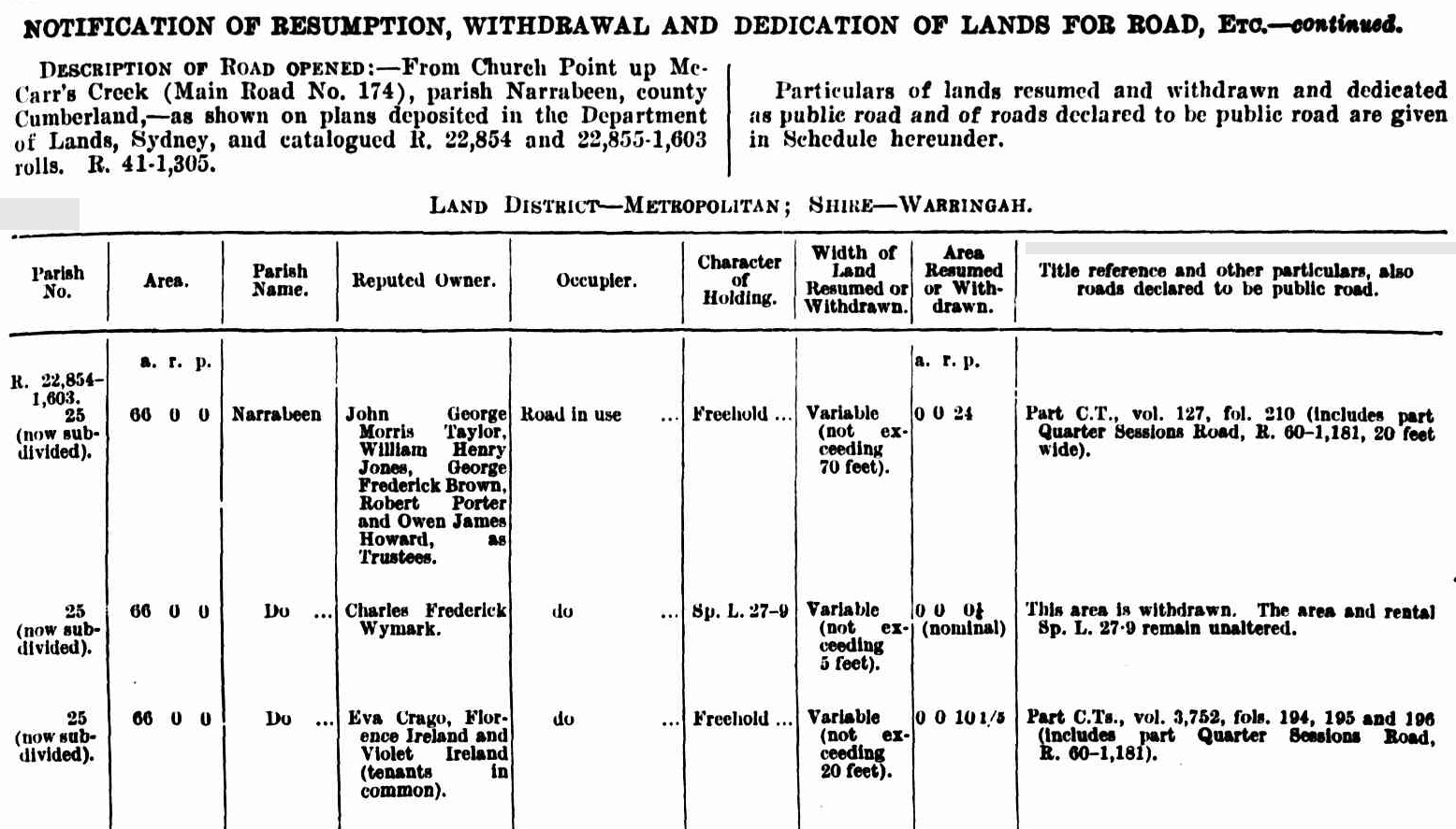 In conformity with the provisions of the Act of Council, William V , No 11, section 21, George Brown being the owner of portion No 6, parish of Narrabeen, applied to the Chairman of the Quarter Sessions for an accommodation road from his land to run through land supposed to be the property of trustees of the Wesleyan Church Dr Tibbetts and Alfred McIntosh being part of Olivers grant, portion 7, until it should meet the road from Manly, at the public wharf Church Point, Pittwater, such being the nearest highway. Evidence was given by the applicant that he had no thoroughfare nor right of away to get to a highway from his land as described consisting of 11 acres, and the accommodation road he now applied for was the best available, considering all the interests. No objection was raised to the road being made and the application was granted by His Honor. QUARTER SESSIONS. (1897, November 19). The Sydney Morning Herald (NSW : 1842 - 1954), p. 3. Retrieved from http://nla.gov.au/nla.news-article14100043