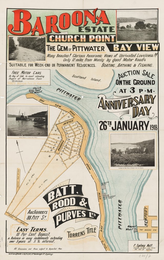 The stranger can scarcely tell where Pittwater is as distinguished from Bay View. There is a romantic bay, with boats speeding back and forth, islands about the mouth of the bay, one of them called Lion Island, all looking vague, shadowy and uncanny. The road around the bay is perfectly level. There is a first-class boarding house kept by Mr. Buist, and the Post Office is boomed by Mr. Roche, who is also an enterprising News-agent, Poulterer, Orchardist, etc. Pittwater Points. (1898, October 1). The Mosman Mail (NSW : 1898 - 1906), p. 2. Retrieved from http://nla.gov.au/nla.news-article247003517
