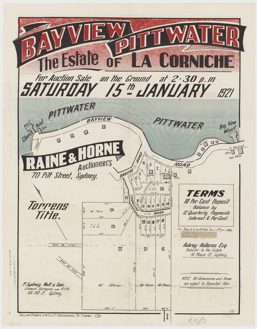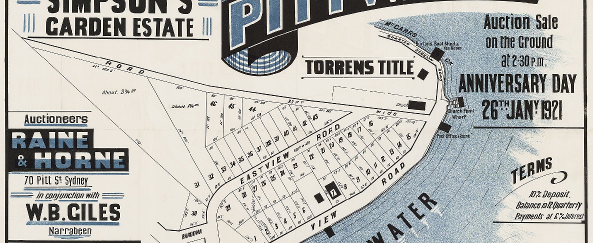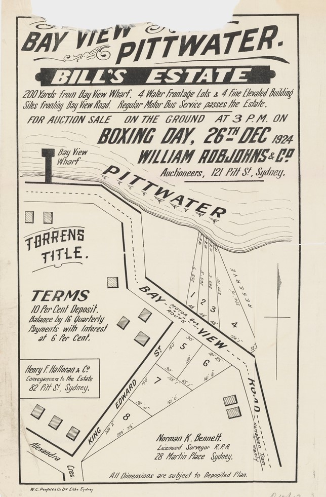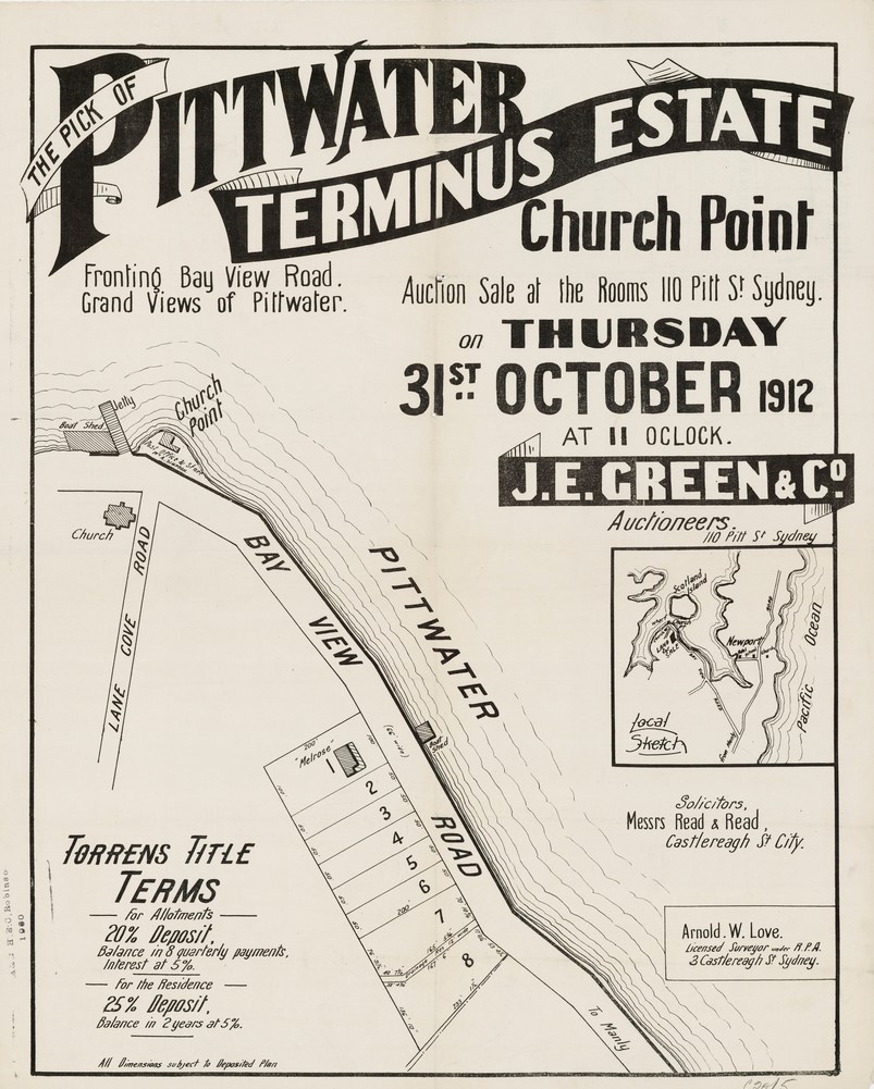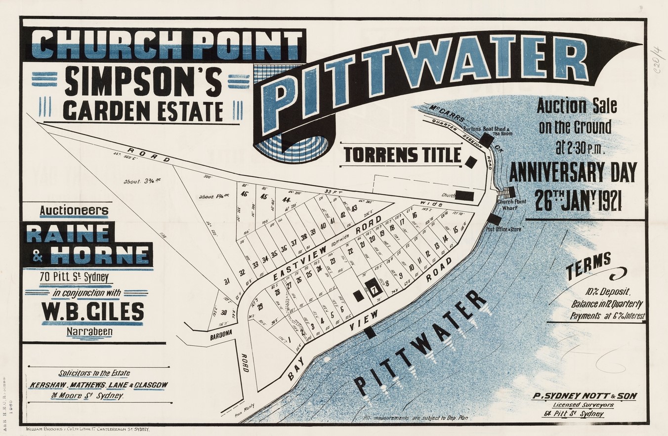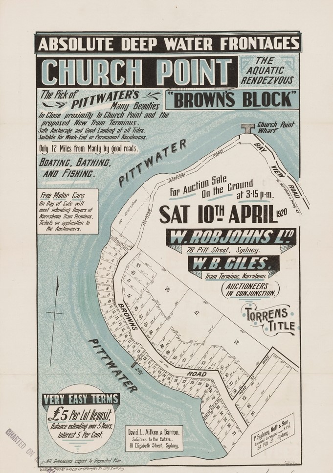 HARDIE and GORMAN have received instrnctions to sell by public auction, at their Rooms, Pitt-street, at 11.50 o'clock, WEDNESDAY, 20th September, 100 acres of land at Pittwater, the choicest spot In the whole district, and which was selected by the present owner as a site for a residence. Advertising (1882, September 7). The Sydney Morning Herald (NSW : 1842 - 1954), p. 15. Retrieved from http://nla.gov.au/nla.news-article28376790