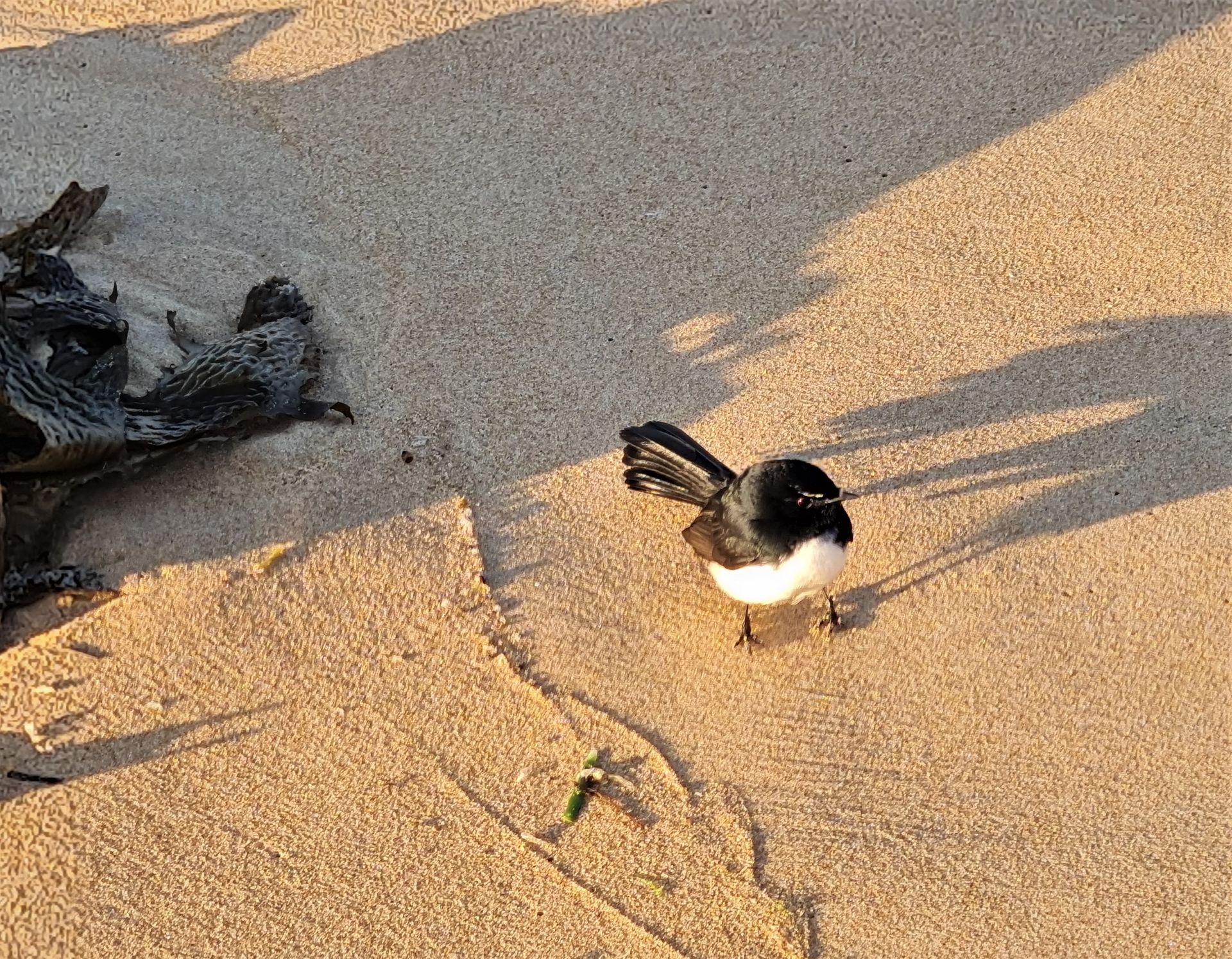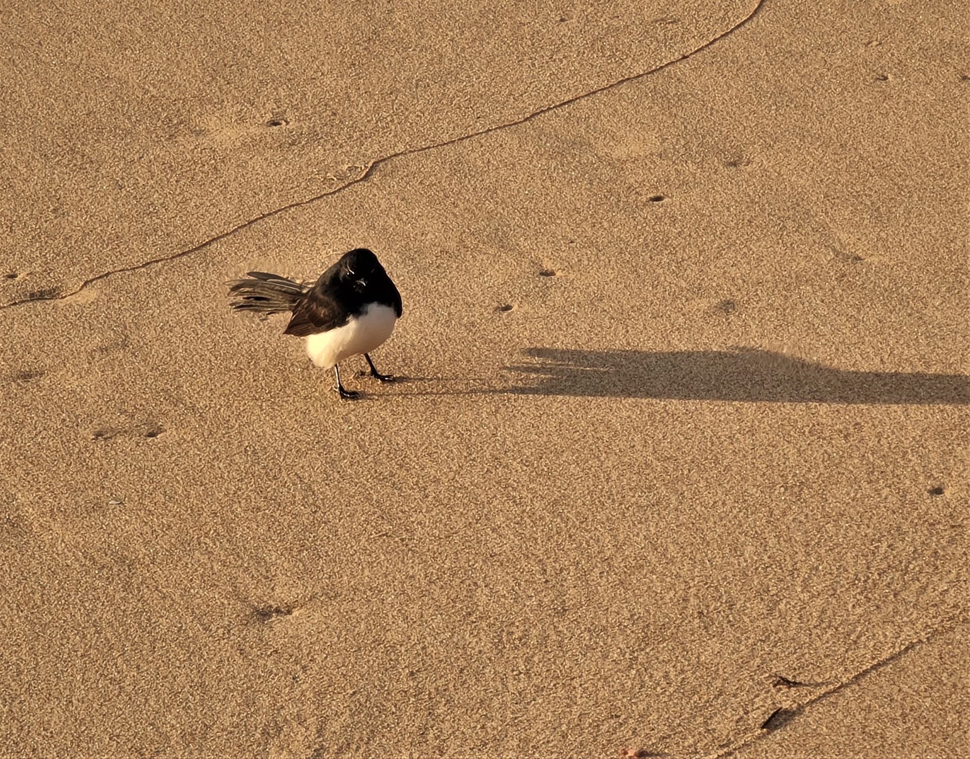 The thing that I do remember well is that I met my old companion (the Willy Wagtail) on the beach and he followed me for a good 100m. I think I disturbed the ground insects around the washed up seaweed, which helped in his search. But it was an enjoyable experience, as he was always close by.