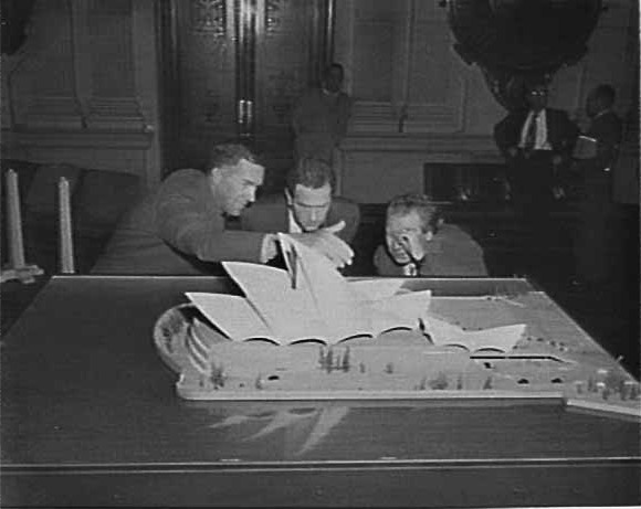 Speaking at a lecture arranged by the Arts Council at the Public Library, Mr. Goossens said, "An opera house for Sydney is not as far away as you might imagine." Following the rejection of Fort Macquarie as a site, a new one is being considered," Mr. Goossens added. Mr. Goossens said that during his recent visit to Italy he had conducted in the opera house at Reggio, Calabria, on the southern tip of Italy. "This is a perfect opera house and I am getting plans of it to use as a basis, on an enlarged scale, of one for Sydney," he said. "It won't be so long before what we've hoped for and dreamt of for such a long time will be a fact," Mr. Goossens said. OPTIMISM ON SYDNEY OPERA HOUSE PLANS (1951, November 14). The Sun (Sydney, NSW : 1910 - 1954), p. 2 (LATE FINAL EXTRA). Retrieved from http://nla.gov.au/nla.news-article230844659