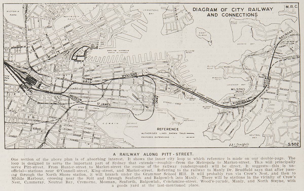 A Railway along Pitt Street - diagram of city railway and connections 1926. Text under the image reads as follows: One section of the above plan is of absorbing interest. It shows the inner city loop to which reference is made on our double-page. The loop is designed to serve the important part of Sydney that extends - roughly - from the Metropole to Market-street. This will principally serve Pitt-street. From Hunter-street to Market-street the course of the railway (underground) will be direct. It suggests - this is unofficial - stations near O'Connell-street, King-street, and Market-street. Referring to the railway to Manly Dr Bradfield says that after passing through the North Shore station, it will branch under the Grammar School Hill. It will probably run via Crow's Nest, and then to Middle Harbour, crossing near the Spit and through Seaforth and Balgowlah into Manly. There will be stations in the vicinity of Crow's Nest, Cammeray, Neutral Bay, Cremorne, Mosman, Seaforth, Balgowlah, Condamine-street. Wood's-parade, Manly, and North Steyne, with a goods yard at the last-mentioned place. From the collections of the State Library of New South Wales, Sydney Mail 1 September 1926 p14
