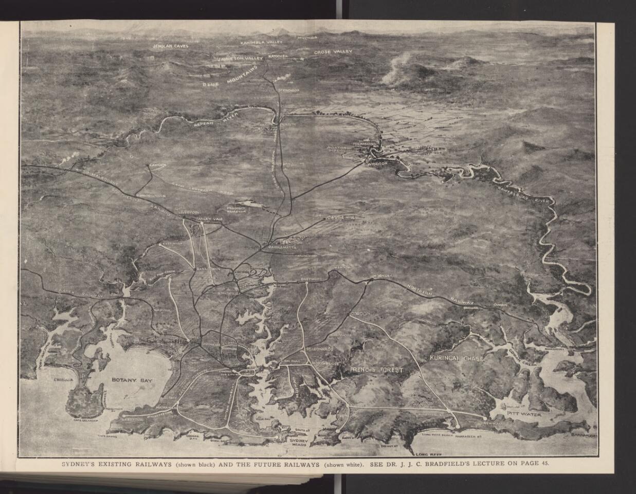 "A railway," he added, "will extend from Athol through Mosman, via the bridge, into the city, whilst Manly, Narrabeen, and Pittwater will also be connected to the city via the bridge, and it will be seen at a glance how the bridge and these railways will open up the northern suburbs, and give them direct railway communication with the city and southern suburbs. To-day it takes 84 minutes to reach the G.P.O. from Narrabeen by tram, boat, and the George-street tram, but via Mosman and the bridge by electric train it would take only half an hour. Manly to-day is about 40 minutes distant from the G.P.O. by boat and the George-street tram; via the bridge, with a non-stop train, it would take 18 minutes, unless, as often happens, the slow trains stop at the stations, but the through trains frequently stop between stations. (Laughter.)