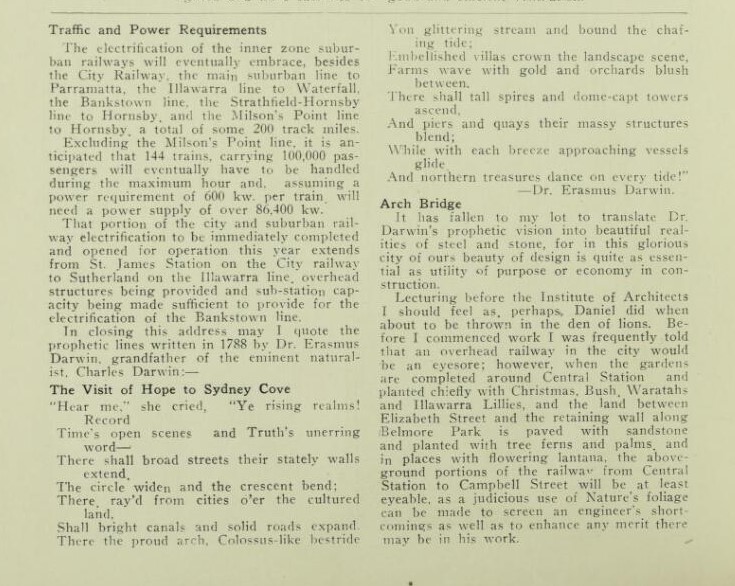 "When the. break of gauge question is settled, the transcontinental express will start at, say, Rockhampton on its run of 3880 miles to Fremantle, and will pass through Sydney, via the Sydney Harbour Bridge, thus shortening the distance by several miles. The same carriages will run right through, steam and electric locomotives only being changed at various pre-arranged stopping places, Sydney becoming, as it were, a wayside station. The bridge is destined to carry this traffic."