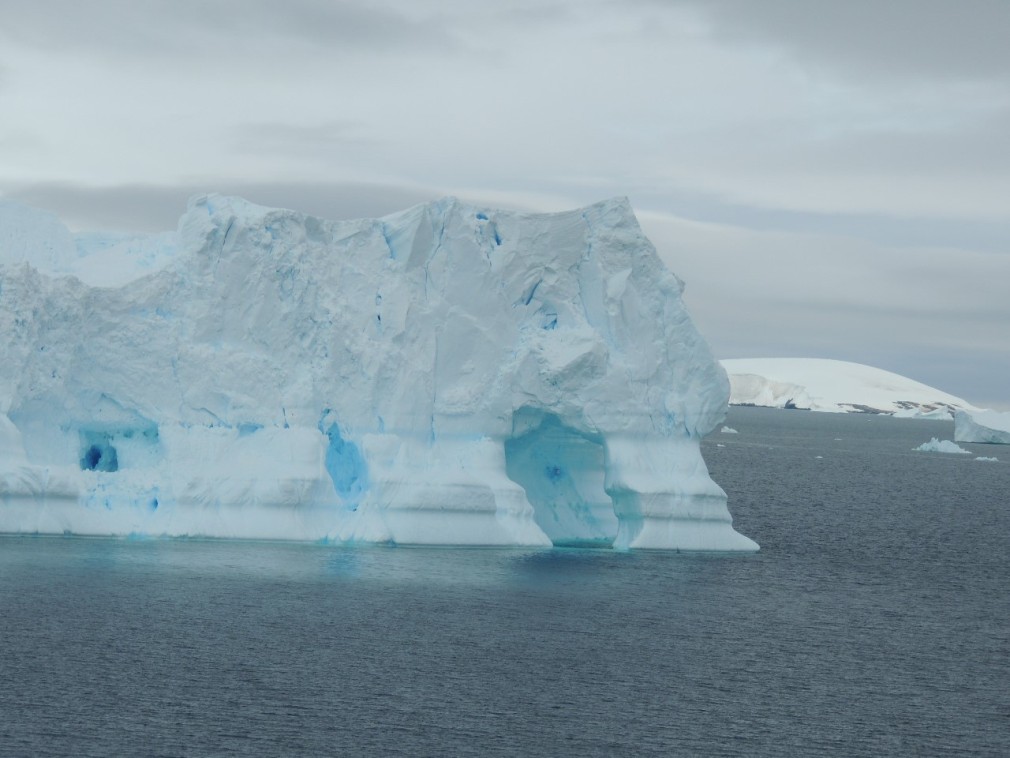 Next day we are cruising Wilhelmina Bay. Icebergs fascinate. They are sculpted in a myriad of shapes. Some are massive chunks of ice with turquoise blue around the base. One is flat-topped, a perfect resting place for a seal. A face of an iceberg is covered in striations as if scratched by claws. A sunny day illuminates this landscape in all its glory. Rocky crags and the shiny whiteness of ice mirrored in navy water. Penguins flit past rippling the surface. ‘Listen over the side of the ship,’ a friend says, ‘you can hear the ice crackling.’