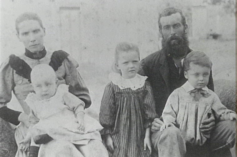 Mrs Florence Larkin with two of her sons, William and Jock, and her sister outside the Larkin family home "The Pines" at the corner of Mona Vale Road and Powderworks Road, Ingleside. Sister reported as A Hewitt - other sites state is a friend of the mother only. The phootgraph was sent to Arthur Larkin in France during 1916 (WWI). 1916 - courtesy Olga Johnson and Pittwater History Unit - Mona Vale Library