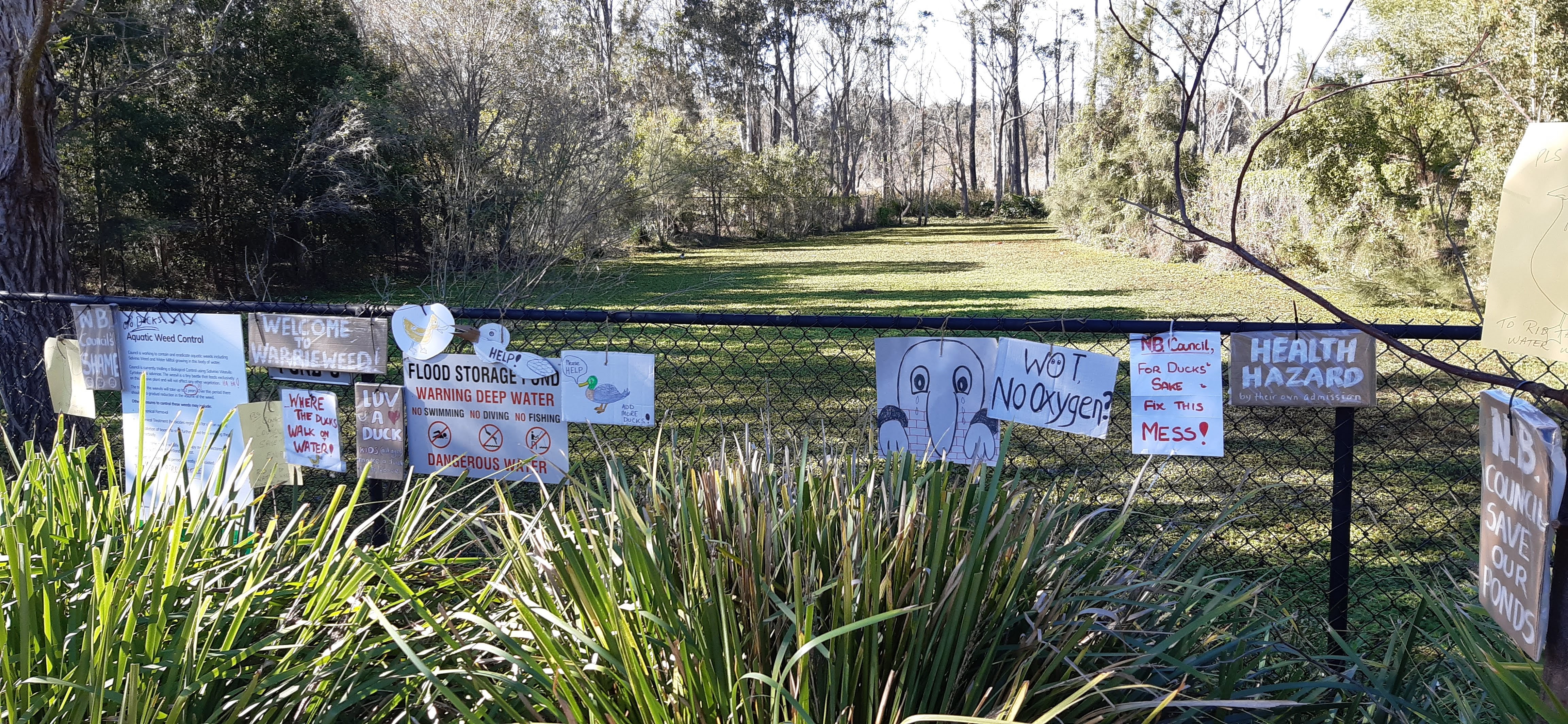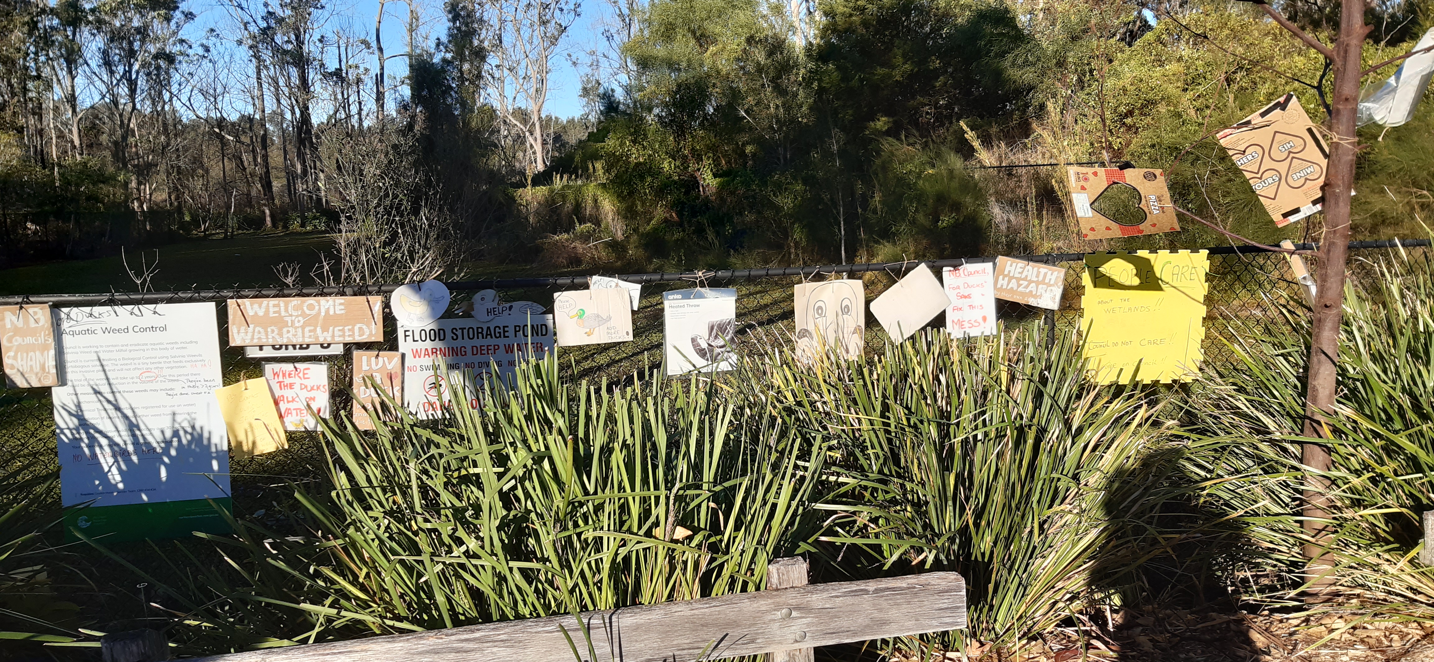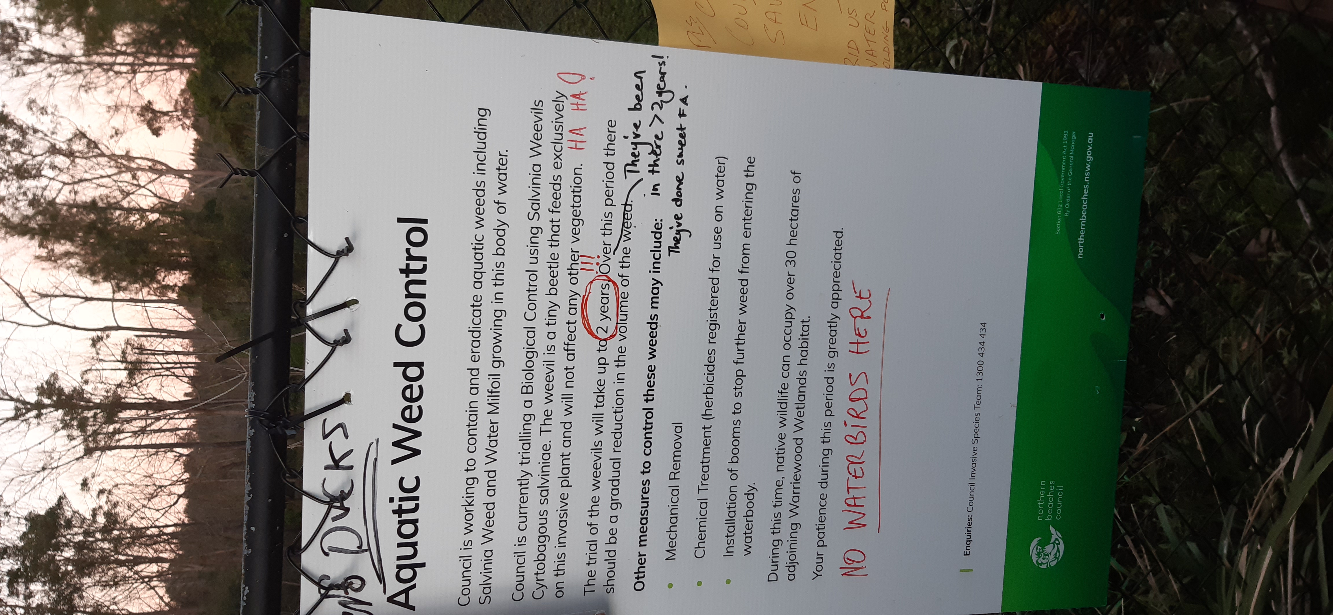 After your story/Facebook post of the invasion of the water weeds in pond 3 in Shearwater Estate and surrounds of the wetlands, plus the Photo on the fence, it has certainly caused a lot of people to become aware of this problem. Many more signs appeared, put there by Residents, Locals, dog walkers, Birders etc so much so that there about 30 plus signs of the non-action for the Council to see.