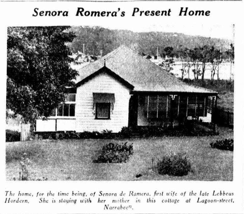 The home, for the time being, of Senora dc Ramera, first wife of the late Lebbeus Hordern, She is staying with her mother in this cottage at Lagoon-street, Narrabeen. Senora Romera's Present Home (1931, November 10). The Sun (Sydney, NSW : 1910 - 1954), p. 8 (FINAL EXTRA). Retrieved from http://nla.gov.au/nla.news-article224283871