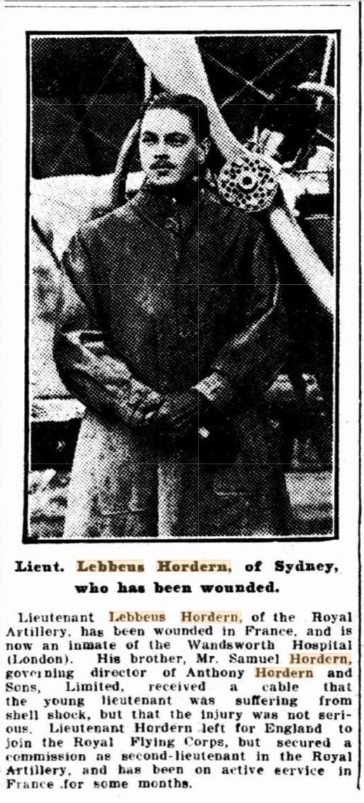 Mrs. Olga Hordern, first wife of the late Lebbeus Hordern, has returned to Sydney on business connected with the estate, and is staying at 52 Macleay Street. Mrs. Monle, her mother, who has been through great trials, having lost two sons at the war, and her husband soon after, is very glad to have her elder daughter back. Young Lebbeus is being educated in Paris, and like his cousin Samuel (only son of Sir Samuel), he Is destined to absorb as much culture as possible. Anthony Hordern's only son, young Anthony, is also being brought np on the same lines. Sydney’s Social Sids. (1928, November 24). Leader (Orange, NSW : 1899 - 1945), p. 3 (The Leader Sporting Weekly Edition). Retrieved, from http://nla.gov.au/nla.news-article254505112