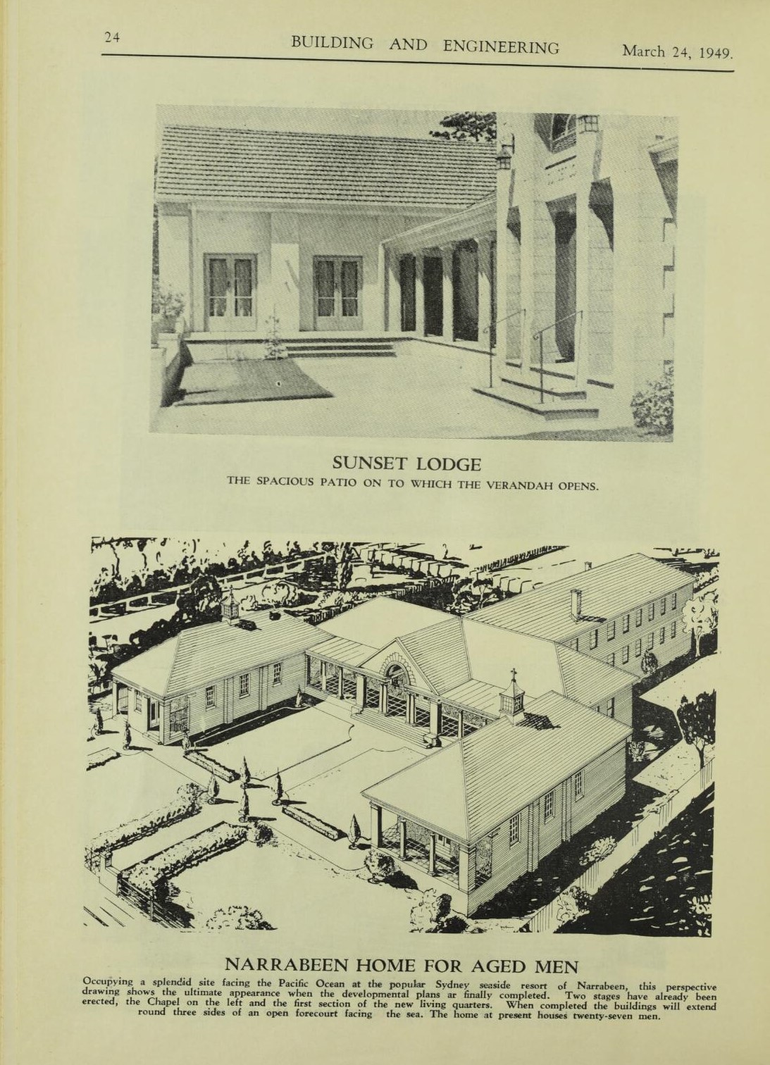 Narrabeen home for aged men – Methodists - Master Builders' Federation of Australia & Illuminating Engineering Society of Australia (N.S.W.). (March 24, 1949 edition). CHARMING SUNSET LODGE, Building and engineering Retrieved from http://nla.gov.au/nla.obj-313434351