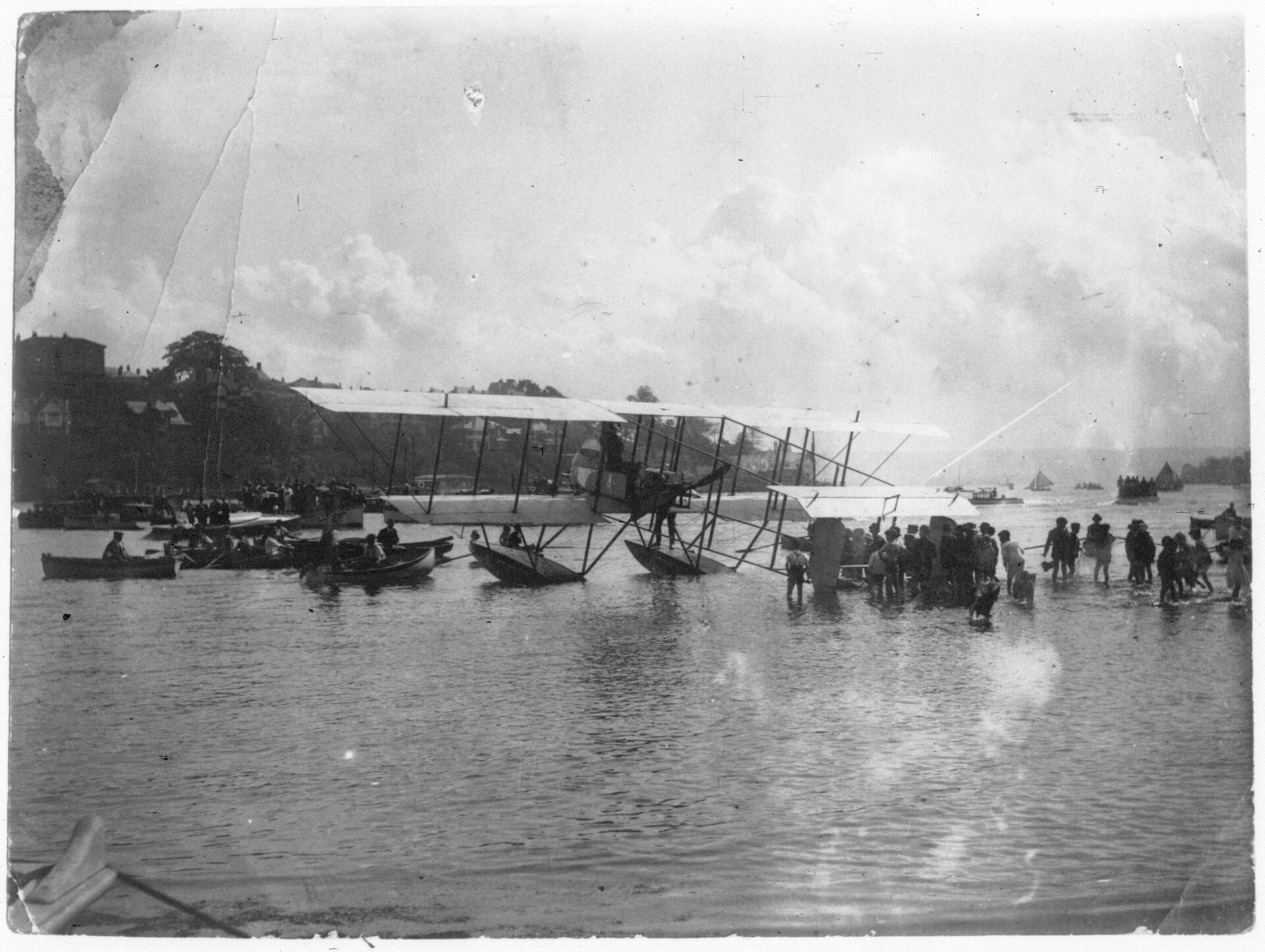 Maurice Farman Hydro-Aeroplane (Hydroplane) imported by Lebbeus Hordern, flown by Guillaux, 1914. Item FL3623144 courtesy NSW State Records and Archives
