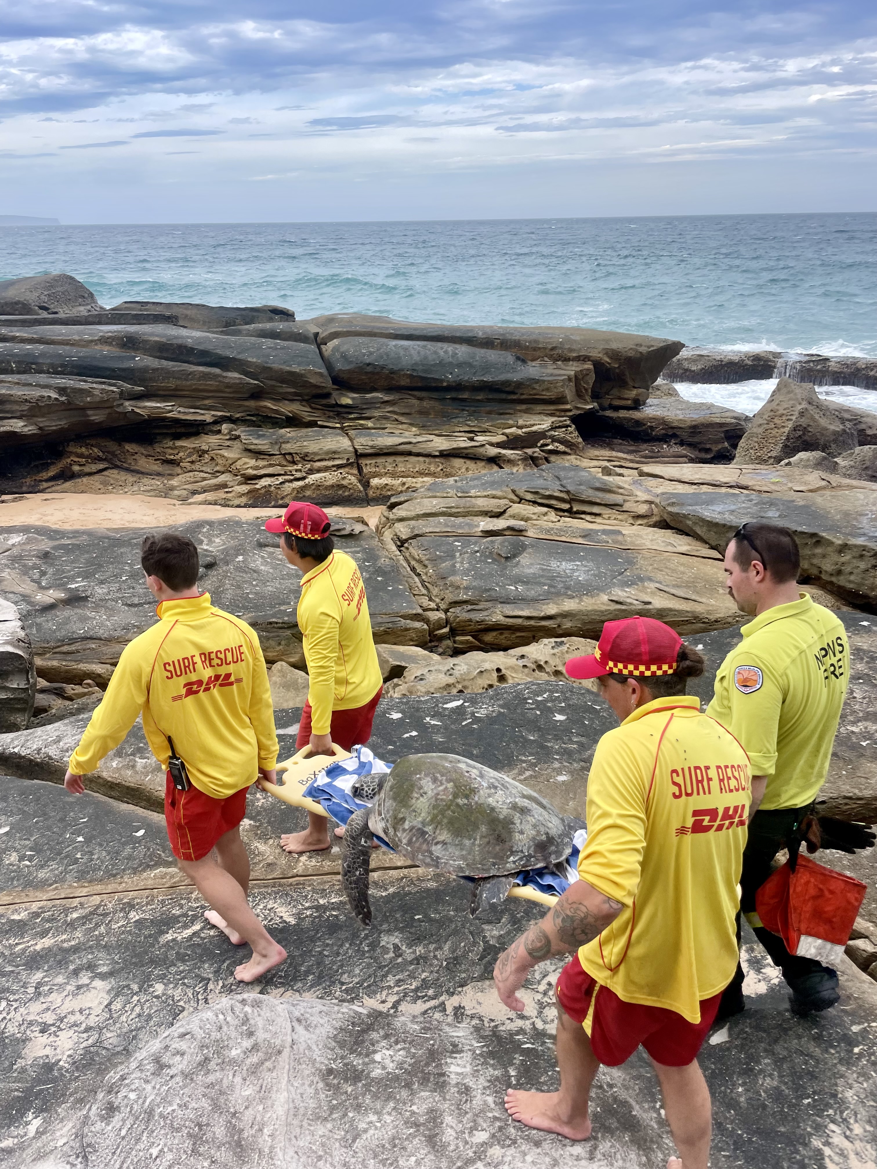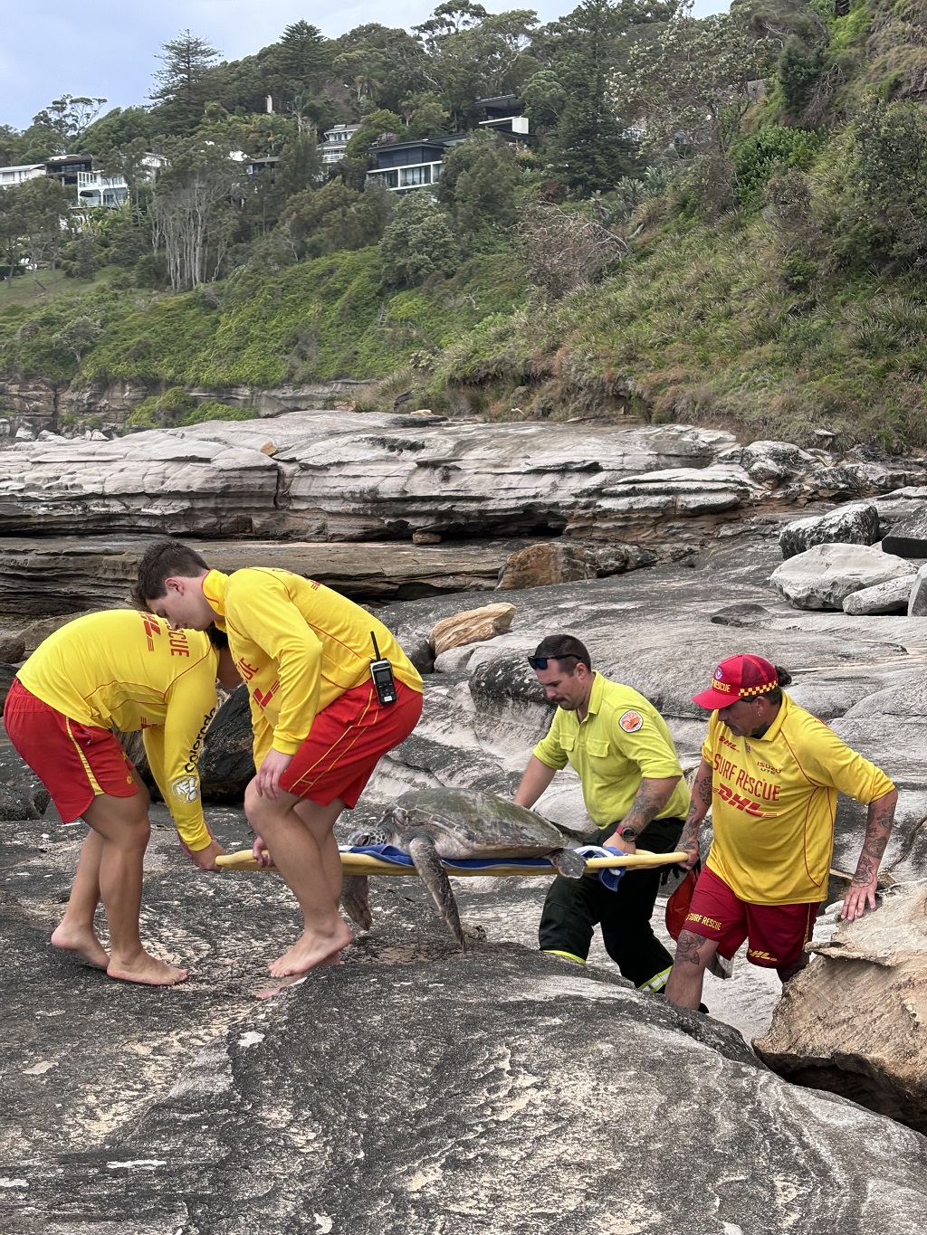 The turtle was too heavy for the lifesavers to move over the rocks, so they called the rescue into the State Operations Centre and NSW National Parks and Wildlife was able to respond to assist.
