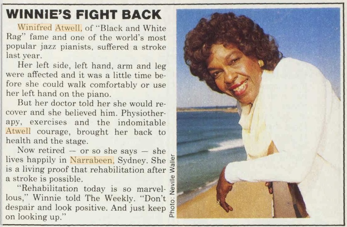 Getting back on top again has been no easy feat but Winnie achieved it and to those who suffer from strokes she advises, "Rehabilitation today is so marvellous. Don't despair and think positive. And keep on looking up." — JILL BOWEN WINIFRED ATWELL (1980, August 6). The Australian Women's Weekly (1933 - 1982), p. 4. Retrieved from http://nla.gov.au/nla.news-article51601995