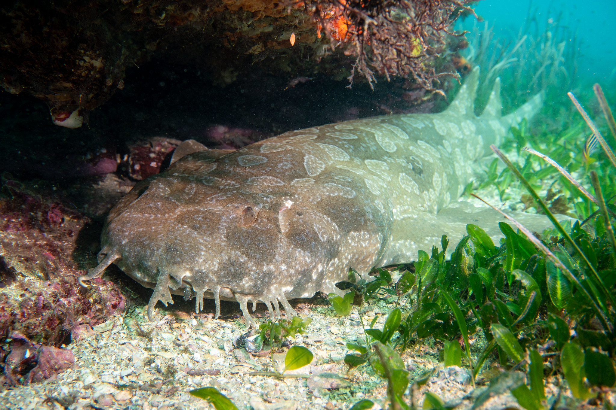 Wobbegongs are often called ‘carpet sharks’ due to the unique symmetrical markings on their backs. The mottled patterns can act as camouflage, helping them stay hidden among rocks and give them an edge for finding prey.