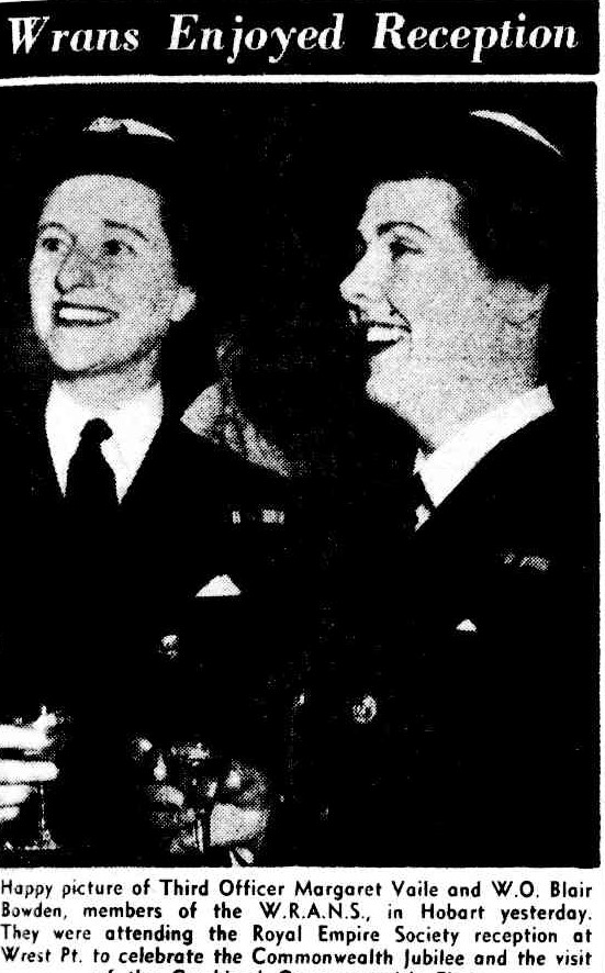 Happy picture of Third Officer Margaret Vaile and W.O. Blair Bowden, members of the W.R.A.N.S., in Hobart yesterday. They were attending the Royal Empire Society reception at Wrest Pt. to celebrate the Commonwealth Jubilee and the visit of the Combined Commonwealth Fleet. Wrans Enjoyed Reception (1951, March 16). The Mercury (Hobart, Tas. : 1860 - 1954), p. 1. Retrieved from http://nla.gov.au/nla.news-article27014060