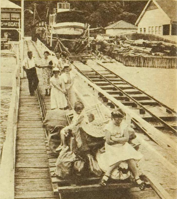 DOWN THE JETTY. Before casting-off children ride on rail-trolley at Palm Beach, where car, trailer are garaged.