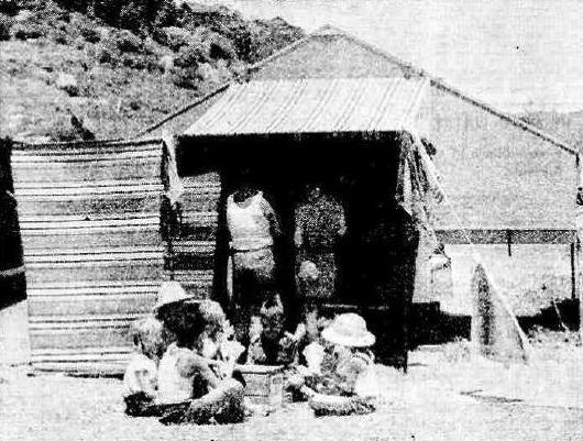 The time-sometime between Christmas and New Year: the place-Palm Beach camping reserve; the spot, the water queue, which in order of the day's chores came after the bread and milk queues. "Just like home." said one woman.