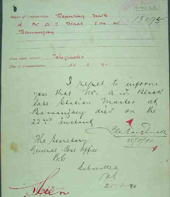This item states Mr. Black passed away at Barrenjoey, at 8 p.m. on August 22nd, 1890 - from National Archives of Australia Barrenjoey records - archived box of materials