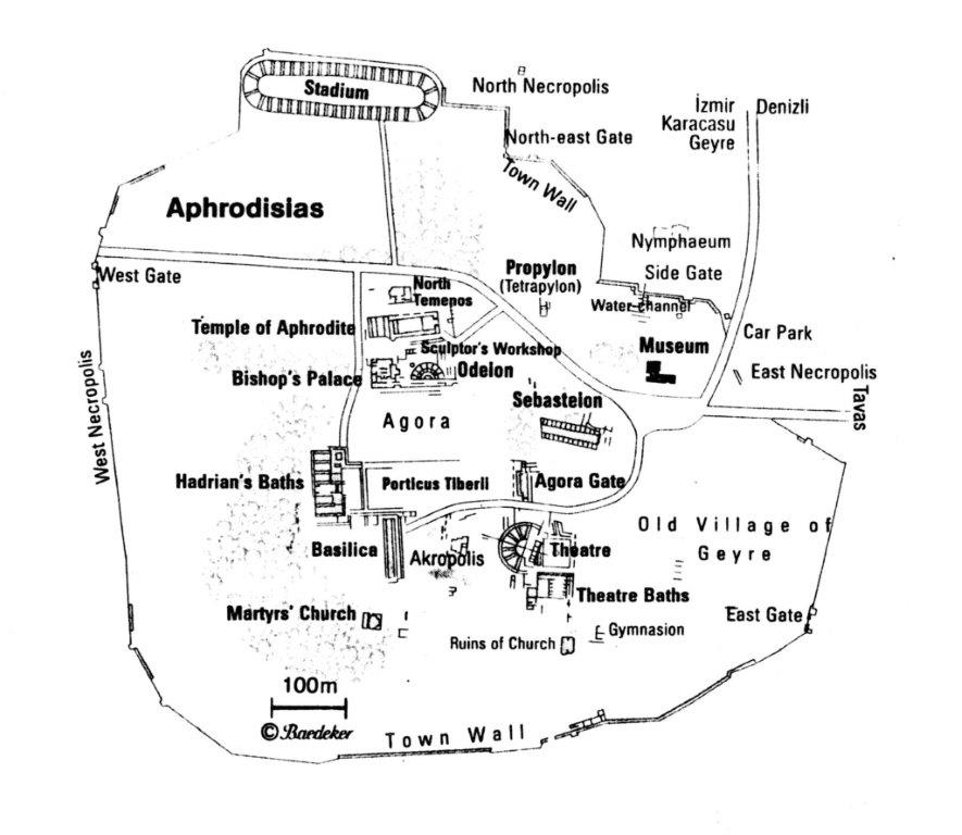 Aphrodisias is located in the province of Aydin, Turkey at the site of the village of Geyre, on a plateau 600 metres above sea level. It is 230 kms. from Izmir.