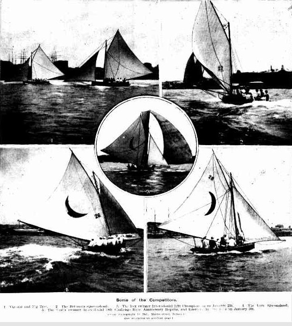 The Intercolonial Sailing Carnival at Sydney was brought to a close on Saturday last, when a race for l8-footers and one for 22-footers was sailed. As will be seen by our sporting columns, the prizes in each event were secured by Sydney bouts. The carnival all through has produced excellent sport, and the management of the whole carnival reflects great credit on all concerned. The success of this carnival augurs well for future events of the kind, public interest in the races being very great. This week we give pictures of the Vigilant (N.S.W.), built by Golding, and sailed by W. Read, which won third prize in the Intercolonial 22ft Championship Race on January 23, and second prize in the Intercolonial 22ft Challenge Race at the Anniversary Regatta; Fig Tree (N.S.W.), owned and built by R. Stevens, sailed by Chris. Webb, second in the Intercolonial 21ft Championship; Britannia (Queensland), owned by H. Anderson and sailed by A. Earle, winner of second prize in the Intercolonial 18ft Championship Race on January 28; lrex (N.S.W.), owned by A. Kinnimont, built by Donnelly, and sailed by Fred. Doran, winner of the Intercolonial 22ft Championship on January 21; Vera (Queensland), owned by J. ll. Whereat and sailed by S. Sandberg; Thalia (N.S.W.), owned by E. S. Abraham and sailed by W. Read, winner of the Intercolonial 18ft Challenge Race at the Anniversary Regatta and the Intercolonial 18ft Race on January 30. By his second win in the Thalia of the 18ft class, and securing a second and third place in the Vigilant in the 22ft races, W. Read is entitled to the prize of ten pounds) given by the Four-Crown Whisky representatives to the most successful skipper in the carnival.