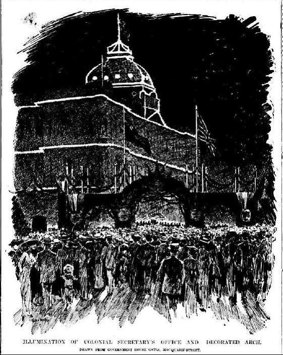 But the storm passed over. The moon emerged from the clouds. The stars shone. There was a belated rush to the city, and tens of thousands of citizens thronged the streets in holiday mood, enjoying the illuminations. And though the crowds were dense in the main thoroughfares, at Circular Quay and in the Domain it was yet possible to get about and see things. The thunderstorm had cleared the air, and those that came into the city were glad they did so. The illuminations, while not being on a particularly lavish scale, were worthy of the occasion. The city was embellished with myriads of coloured lights and lanterns. Sydney decked herself in jewels to welcome her sailors.