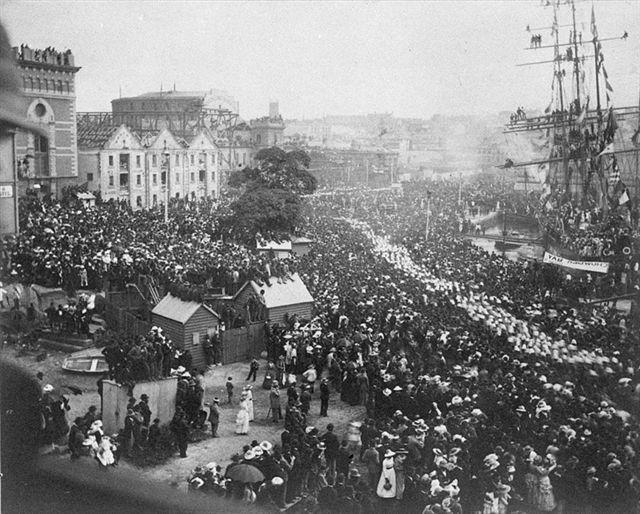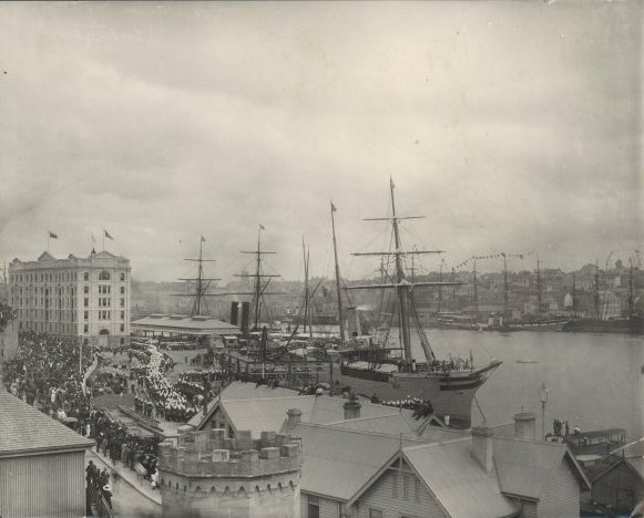 'Well done N.S.W. God speed': [departure of New South Wales Contingent for Sudan war from Circular Quay], 3 March 1885, Image No.:a1528402, courtesy State Library of NSW.