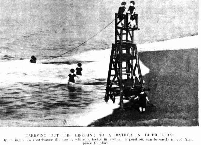 To bring the wheels on to the sand, so that the tower can be moved to another part of the beach, the main uprights at the back are hinged a couple of feet from the bottom, but when stationary this portion is kept firmly in position by iron bolts, which can be easily drawn. In front there is a pole with a cross-bar for the purpose of pulling it. The pole is close to the ground, and when the tower is to be moved the rear part on the hinges falls back, the machine rests on the wheels, thereby raising the front portion sufficiently to keep it clear of the sand while being moved. An alarm bell is at the side, to be rung when anyone is in difficulties and assistance required. In addition to keeping the line clear of the crowd the machine will enable the men working it from the tower to keep the belt man in view all the time, and thereby prevent the line being drawn in before he has reached the person in danger. It is also claimed that the line being manipulated from a height will be of considerable advantage in lifting rescuer and rescued up when being pulled in. The box at the rear has the line coiled in it, which the inventor considers is preferable to having a reel, on which the line frequently tangles, thereby necessitating a man always being at the brake when in use. A reel, however, can be attached if preferred. The model can be seen at Cole's Book Arcade in George-street.